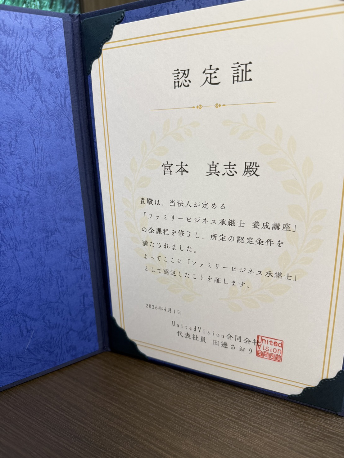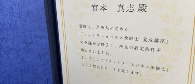 この度、かねてより受講していました「ファミリービジネス承継士」の課程を修了し、無事に認定をいただくことができました。